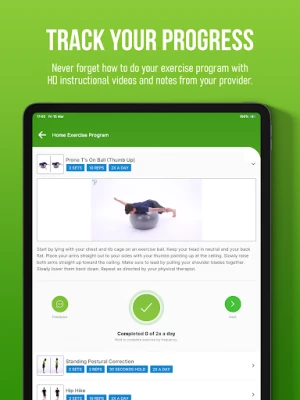 Using this app, you can access your personalized Home Exercise Program with HD Instructional videos. On the 'Messages' tab, you can securely communicate with your Ambassador PT provider. As you make progress in your program, you'll earn virtual trophies and achievement badges to celebrate your milestones! Visit the 'Awards' tab to see your achievements and track your progress.